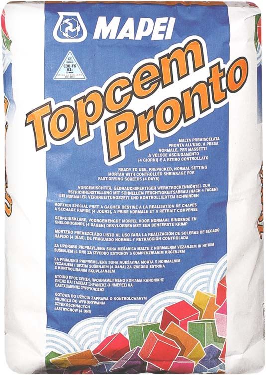 Стяжка Mapei Topcem Pronto – это уже смешанный, готовый к применению состав с нормальным схватыванием и контролируемой усадкой, в основе которого специальный гидравлический вяжущий и отборный заполнитель. Стяжка позволяет качественно и быстро выполнить работы (4 дня).